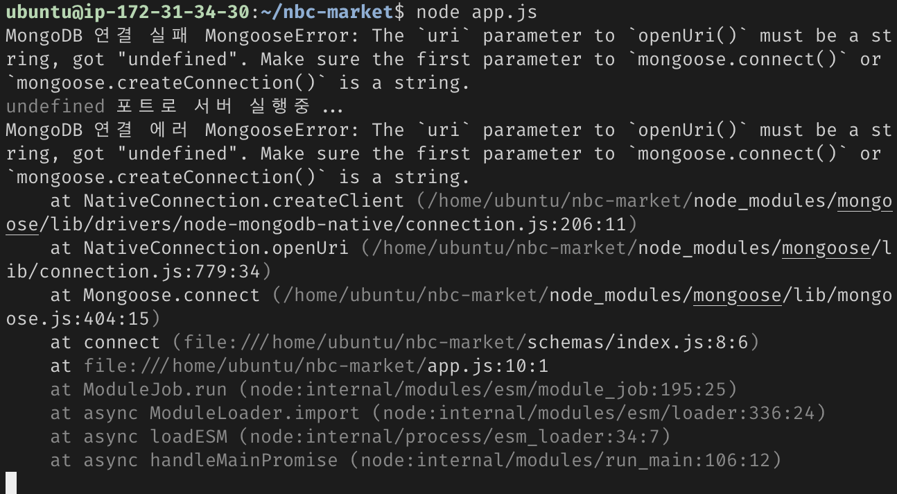 노드로 app.js를 실행 했는데 환경변수 gitinore파일에 있는 .env파일의 내용들이 불러오지 못하여서 에러가 발생 한것 같다.