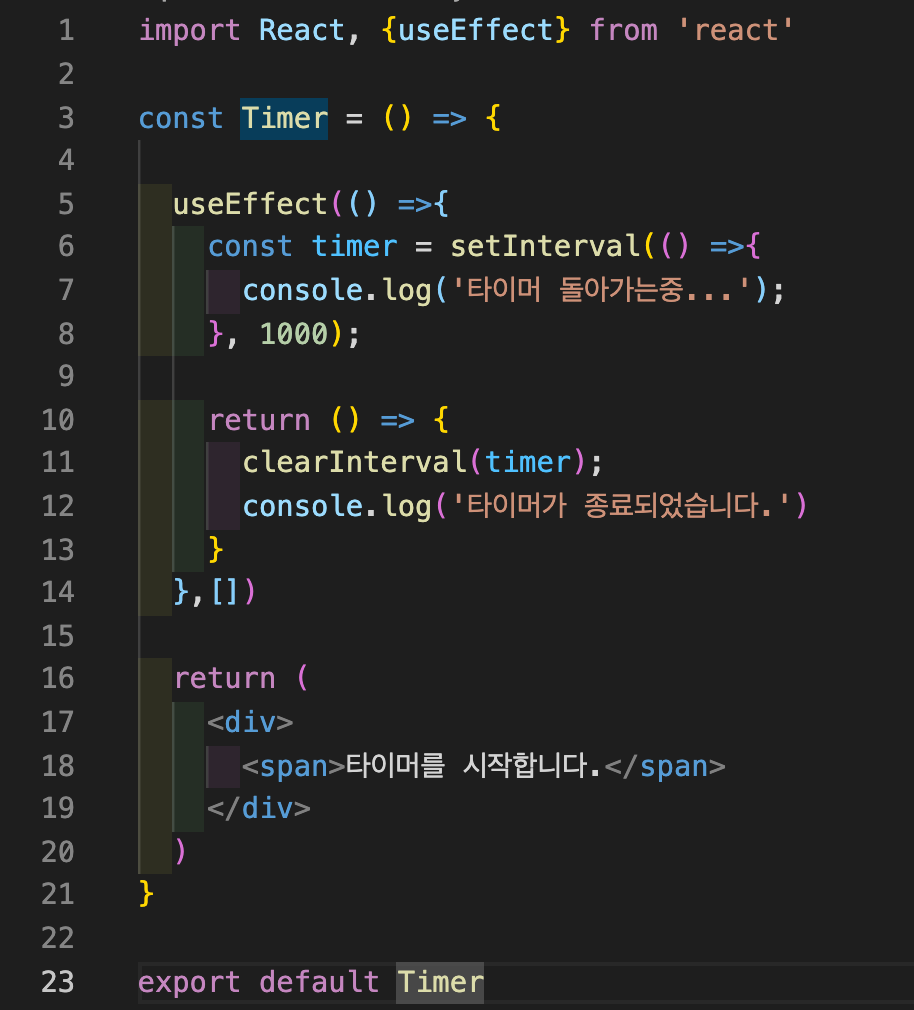 setInterval함수를 통해 1초마다 '타이머 돌아가는중...'이 입력되고 return안에 clearInterval을 활용해 clean up effect를 실행시켜준다.