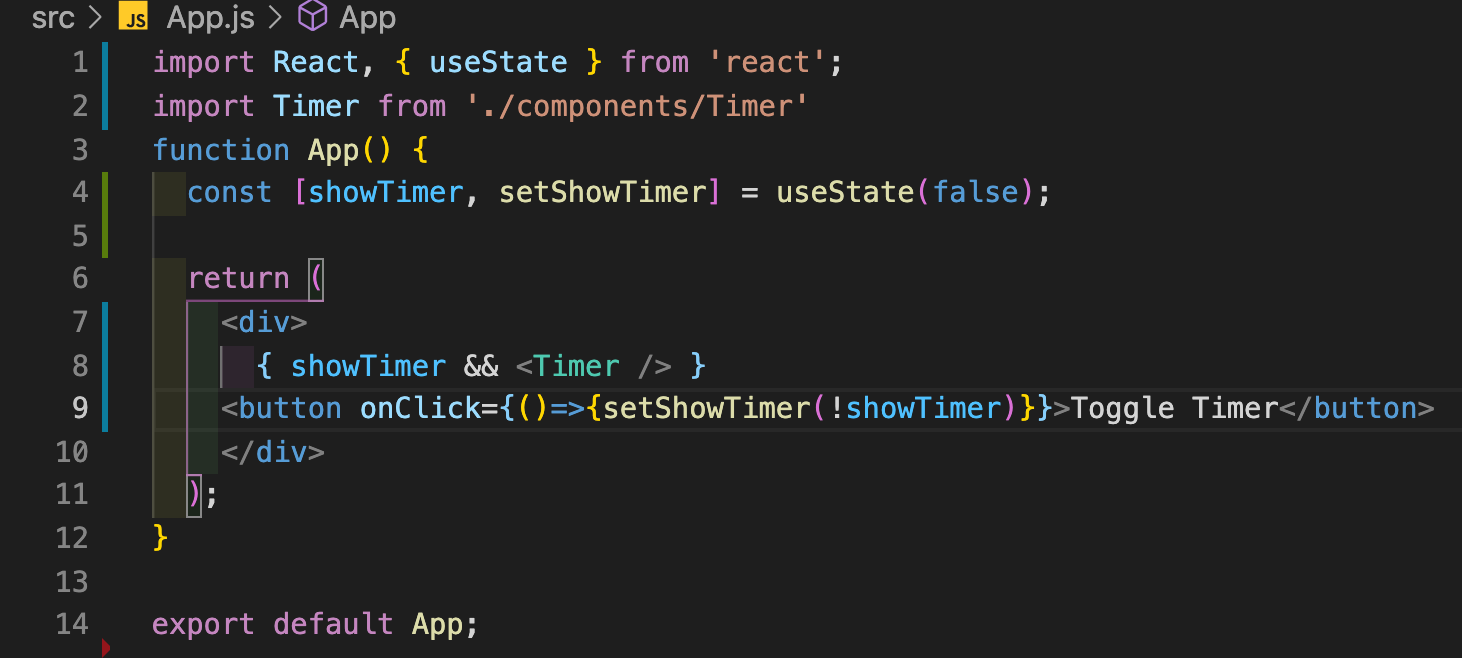 App컴포넌트 안에 버튼을 하나 만들고 누르면 Timer의 컴포넌트가 보여지는 토글이다.